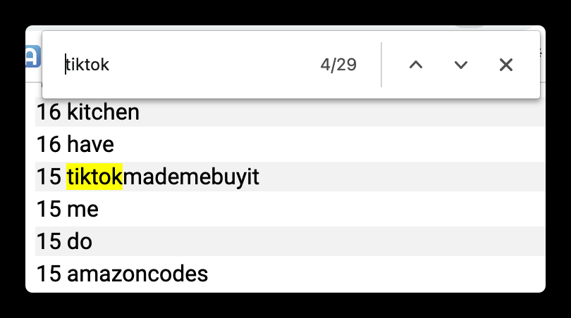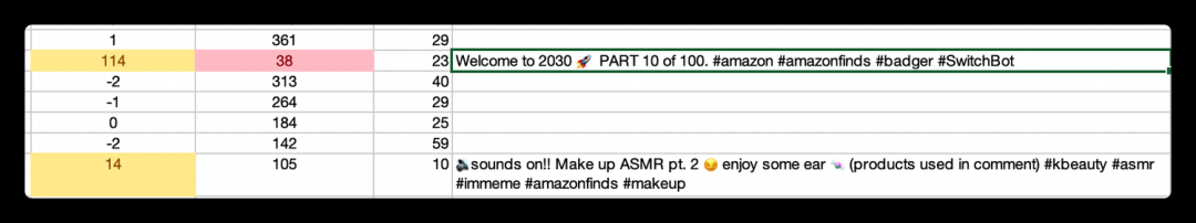 復制粘貼數據里的視頻文案到在線詞頻分析網站(免費的可以用這個 http://www.writewords.org.uk/word_count.asp ),在搜索結果中搜索 tiktok 或者 amazon ,就可以找出所有和該標簽相關的子標簽。