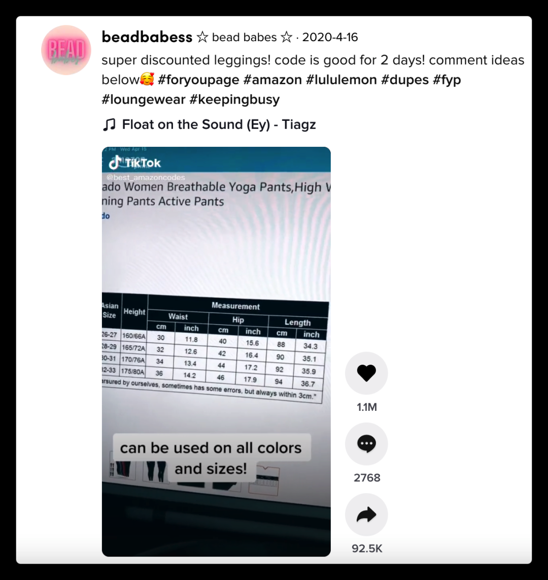 比如 leggings 這個產品在2020年4月的 #amazon 標簽下,就有 1.1M 贊的視頻。如下圖所示。