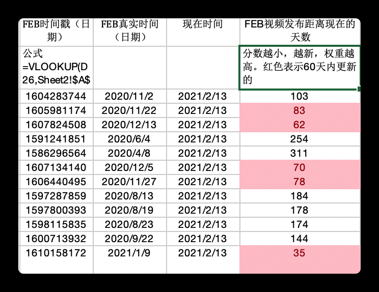 上圖,我們算 FEB 的視頻距離現在的時間,現在是2月13日,直接用2月13日減掉 FEB 發布的真實時間即可。算出來之后就是最右邊的列。我們再用條件格式將某些數據標紅即可快速找到我們想要的較新的視頻。如上圖所示,我把少于90天的數字都標紅了,也就是我把三個月內發布的視頻都標紅了。