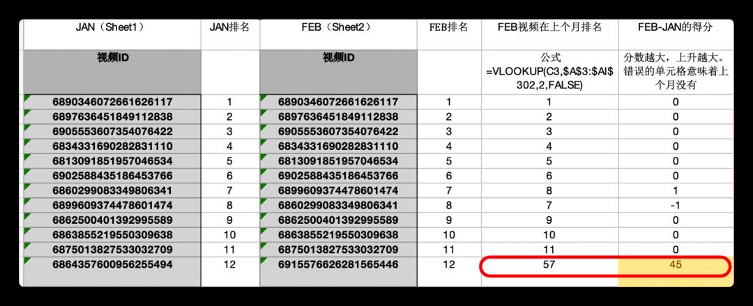 我們可以在 Sheet3 里把這兩者的視頻 ID 和排名分別復制過來,用 Excel 里的函數之王 VLOOKUP 來進行大量的引用。
