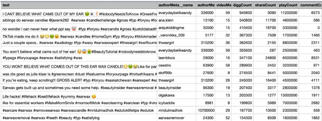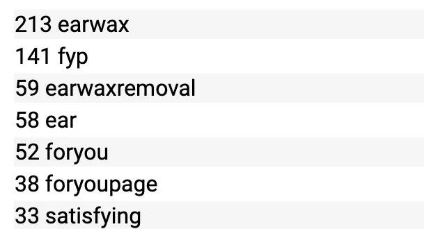 假設(shè)你做著某個領(lǐng)域,有些標(biāo)簽可能是你沒有想到,但是別人卻在用的,通過這個工具也可以直觀的找到。還是以 #earwax 舉例,我可能不知道原來 #satisfying 這個標(biāo)簽有那么多人用,但是現(xiàn)在一拉數(shù)據(jù)就知道了,那我在做號的時候,就會加上這個標(biāo)簽。