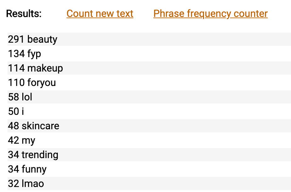 比如美妝方向的大詞 #beauty ,把標(biāo)簽和視頻描述一起做詞頻分析,可以看到原來 lol,Imao,funny 之類的表示搞笑的詞匯,出現(xiàn)頻率是很高的,那么選取美妝視頻的時候,可以多注意那些既是美妝領(lǐng)域,又有點搞笑的視頻,爆的概率就大一點。