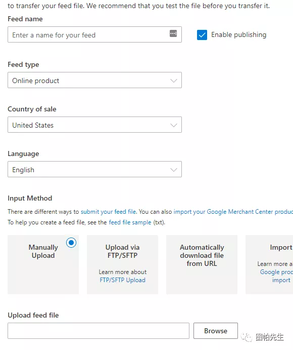如果你不要導入的Google購物廣告系列,需要從頭開始,拿就要創建一個新的Feed并手動上傳。
