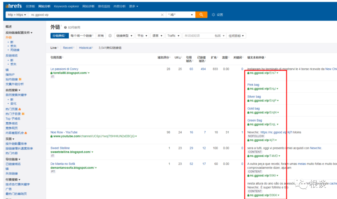使用第三方外鏈導出工具的關鍵在于找到合適的對標競品,競品是最好的模仿對象,由于資源在推廣競品,說明受眾相似,成功合作的機會會更大一些。Ahrefs是一款SEO分析工具,同樣也可以分析單個頁面的推廣流量情況。導精準的外鏈關鍵在于找到合作的網址,比如:我們發現一個Banggood服裝站newchic外專門的縮站外推廣鏈接:https://nc.ggood.vip/U1j5 ,我們也可以放在外鏈分析工具里面去抓取二級域名的部分https://nc.ggood.vip 不出意外導出的外鏈應該是所有由newchic內部主動發起合作的資源。
