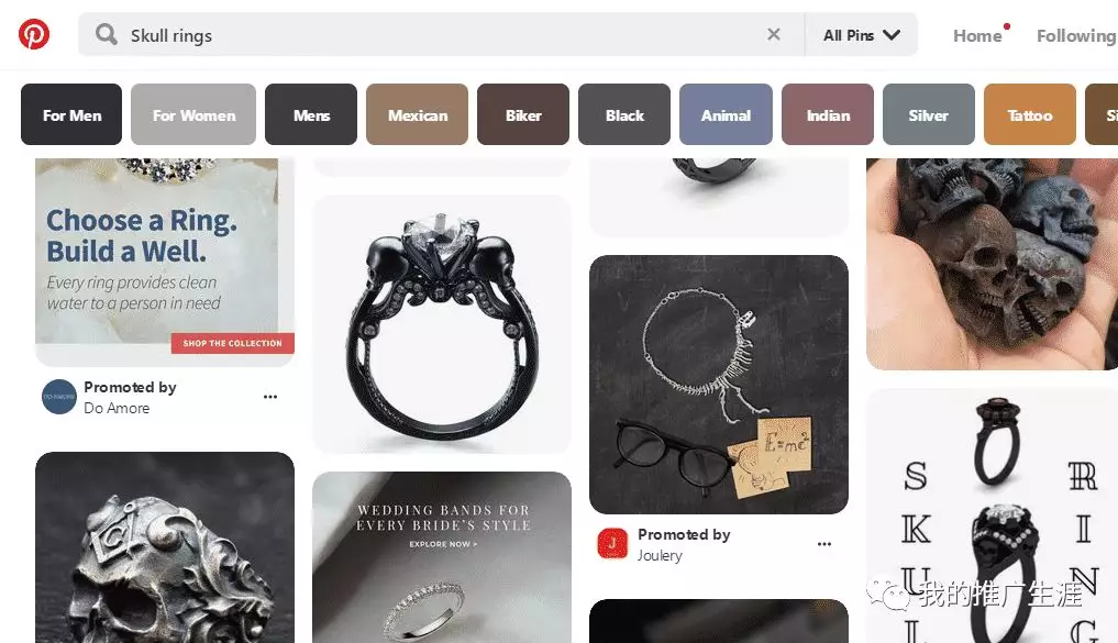 我這里舉個例子,搜索“skull rings”,大家可以去看下基本上出現的每張pin標題都是含有skull rings的。部分的圖片沒有“skull rings”,那是因為pinterest AI智能去判斷圖片上面的產品到底是什么。