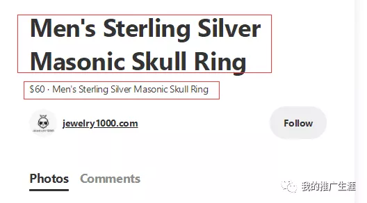 我這里舉個例子,例如你的pin標題是“skull rings”,但是鏈接的網頁產品標題是“couple rings”,那么這就會讓pinterest認為你的在誤導,欺騙用戶,從而你的pin不會有好的排名。