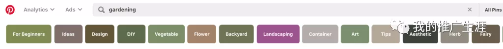 同時你也可以看到Pintereest還會推薦一些關鍵詞在搜索框的下方,你可以繼續點擊每個顏色框可獲得越來越多的具體建議。