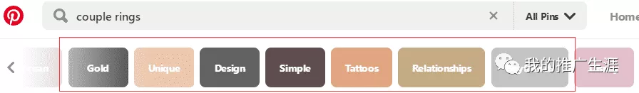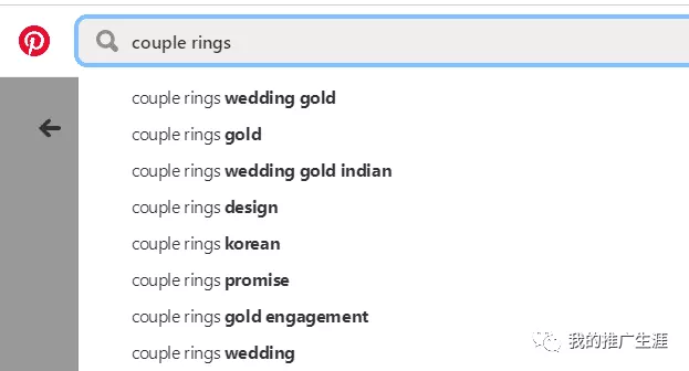 最簡單的方法就是在pinterest的搜索框里面,輸入你的關鍵詞,例如我這里輸入“couple rings”,可以看到下拉框里面會顯示一些相關的,高熱度的關鍵詞,你可以從這些關鍵詞里面挑選符合自己產品的。