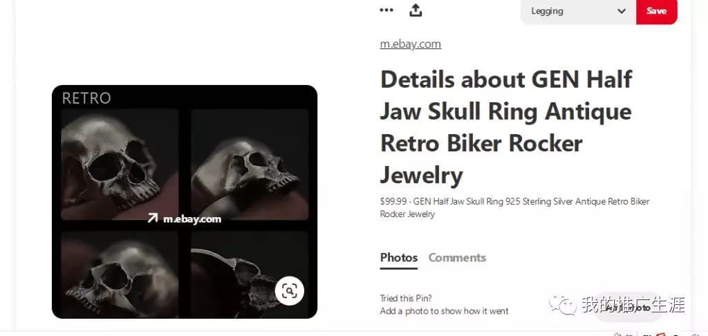 我隨便找了一個pin點擊進入,可以看到上圖,標題和描述是完全不同的,但是都包含了關鍵字“skull ring”,這也是要強調的地方,一個好的描述有兩個作用:1,提升pin排名 2,吸引用戶點擊圖片,進入你的網站。