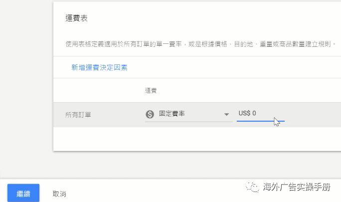 為所有訂單建立單一費率:固定費率0。點擊繼續(xù),點擊保存。