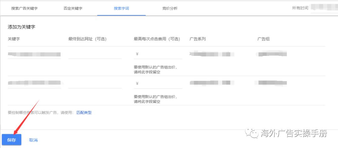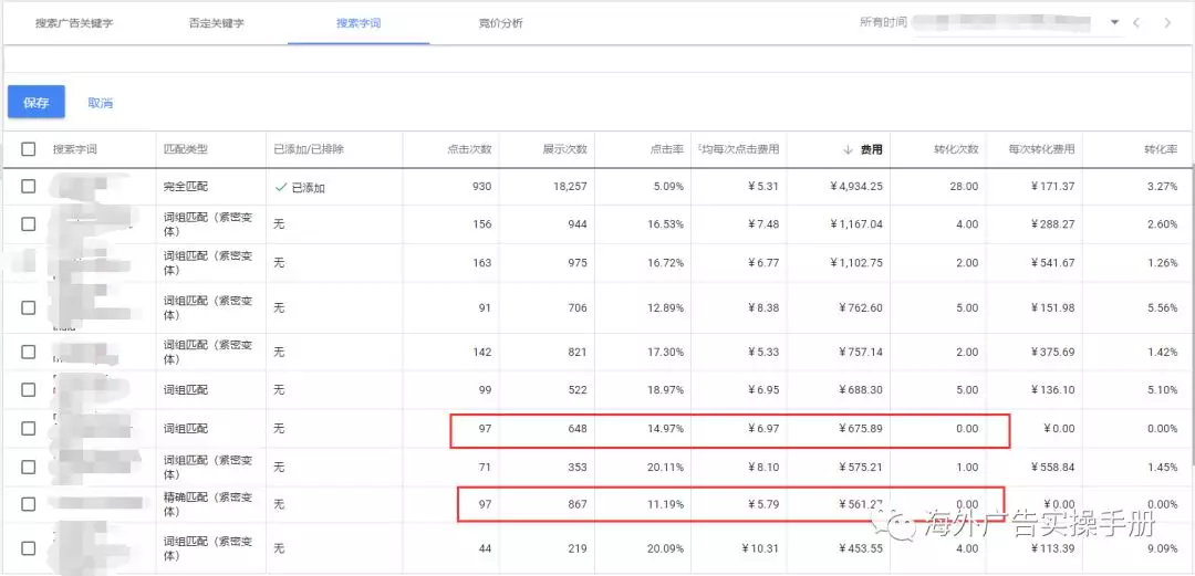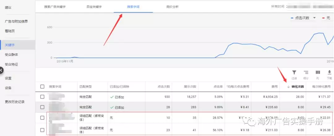 新賬戶(hù)3月6日開(kāi)始投放,截止到今天(3月15日)的數(shù)據(jù): 每次轉(zhuǎn)化費(fèi)用降低55% 轉(zhuǎn)化率提高209% 以上數(shù)據(jù)主要做了以下2個(gè)方面的操作: 如何尋找真實(shí)的用戶(hù)搜索詞 如何尋找否定詞 1 如何尋找真實(shí)的用戶(hù)搜索詞 賬戶(hù)投放一定時(shí)間以后,會(huì)記錄真實(shí)的用戶(hù)搜索詞,這是賬戶(hù)里最寶貴的數(shù)據(jù)之一。下面我們一起來(lái)看一下如何用好這些數(shù)據(jù)。 我們先打開(kāi)一個(gè)廣告組,點(diǎn)擊左側(cè)的關(guān)鍵字 我們可以看到上面有搜索廣告關(guān)鍵字,否定關(guān)鍵字,搜索字詞,競(jìng)價(jià)分析四個(gè)部分。 搜索廣告關(guān)鍵字:我們自己設(shè)置的關(guān)鍵字 否定關(guān)鍵字:我們屏蔽的關(guān)鍵字 搜索字詞:實(shí)際上用戶(hù)點(diǎn)擊我們廣告時(shí)的搜索詞 競(jìng)價(jià)分析:投放中的網(wǎng)站和同行業(yè)網(wǎng)站相比,展示次數(shù)份額,排名等的對(duì)比 打開(kāi)搜索字詞這個(gè)模塊,我們點(diǎn)擊一下轉(zhuǎn)化次數(shù),就會(huì)把搜索詞按照轉(zhuǎn)化次數(shù)排名。 我們可以看到,這里有2個(gè)關(guān)鍵詞,分別帶來(lái)了8次轉(zhuǎn)化,每次轉(zhuǎn)化費(fèi)用分別是22.01元和26.38元,比上面的兩個(gè)詞的轉(zhuǎn)化費(fèi)用更低。這種有轉(zhuǎn)化又花費(fèi)低的詞,要添加成關(guān)鍵字。 點(diǎn)擊關(guān)鍵詞前面的復(fù)選框,選擇添加為關(guān)鍵字。 添加關(guān)鍵字的時(shí)候注意: 1. 關(guān)鍵字匹配類(lèi)型。如果留空會(huì)默認(rèn)為廣泛匹配。 2. 最終到達(dá)網(wǎng)址。如果留空就會(huì)使用默認(rèn)展示廣告的最終到達(dá)網(wǎng)址。 3. 最高每次點(diǎn)擊費(fèi)用。如果留空則默認(rèn)使用廣告組的最高每次點(diǎn)擊費(fèi)用。 這里要注意根據(jù)產(chǎn)品實(shí)際情況做好設(shè)置。 通過(guò)這個(gè)操作,我們就能統(tǒng)計(jì)到一些被我們忽略,但是轉(zhuǎn)化能力很強(qiáng)的詞。這些詞對(duì)比大詞,展示和點(diǎn)擊次數(shù)可能少一些,但是轉(zhuǎn)化率高,且點(diǎn)擊和轉(zhuǎn)化費(fèi)用低。慢慢積累,能逐步降低賬戶(hù)的轉(zhuǎn)化費(fèi)用,提高賬戶(hù)整體效果。 2 如何尋找否定詞 上面的操作已經(jīng)幫助我們把好詞挑出來(lái)加到賬戶(hù)里了。接下來(lái)我們還要把不合適的詞找出來(lái),加成否定詞。 這一步還是在搜索字詞這個(gè)模塊操作,這次我們點(diǎn)擊費(fèi)用,把關(guān)鍵詞按照花費(fèi)排名。 從截圖中我們可以看到,里面有2個(gè)詞,花費(fèi)分別是675.89 和 561.27元,都有97次點(diǎn)擊,但是沒(méi)有轉(zhuǎn)化。這樣點(diǎn)擊次數(shù)多花費(fèi)高但是沒(méi)有轉(zhuǎn)化的詞也要挑出來(lái),分析一下原因。 如果是和產(chǎn)品定位不符合,定位到的客戶(hù)并不是我們的目標(biāo)客戶(hù),就要添加為否定詞。添加成否定詞后,如果再有用戶(hù)搜索這個(gè)詞,我們的廣告就不會(huì)展示了。 操作方法也是先點(diǎn)擊關(guān)鍵詞前面的復(fù)選框,然后選擇添加為否定關(guān)鍵字。 通過(guò)這一步操作,可以極大的降低賬戶(hù)里的無(wú)效花費(fèi),并且提高轉(zhuǎn)化率,提升賬戶(hù)總體效果。
