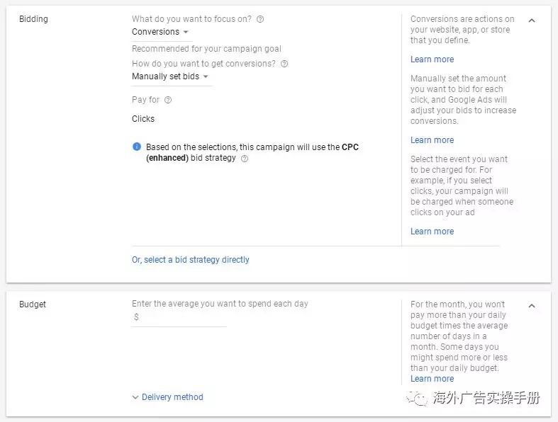 出價方式這里,現在Google推出了按照每次轉化費用付費,按照投資回報率出價的智能出價方式。