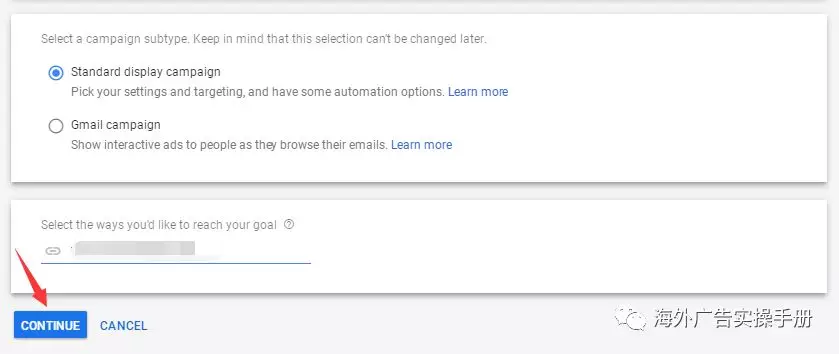 選擇標準展示廣告系列,輸入網址,然后點擊繼續