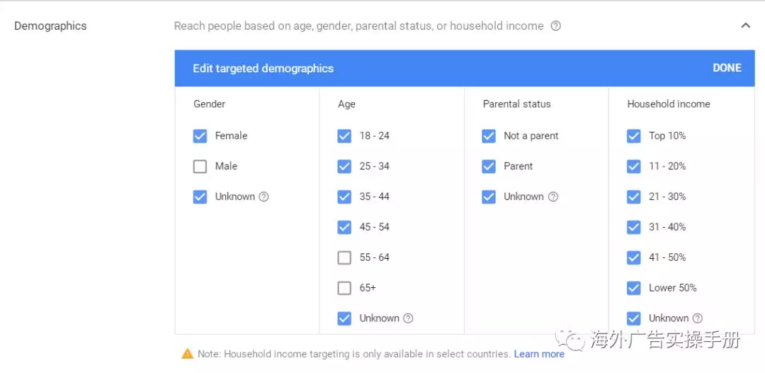 這里注意一下,受眾群體還可以進行細化。比如假發產品只針對女性投放,這里可以把男性去掉