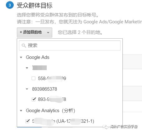 目的地就是這個受眾群體列表要應用到哪些賬號,記得勾選上要投放再營銷廣告的Google Ads賬號。