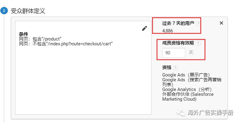 成員資格有效期根據每個行業的特點來設置。舉例來說,如果是B2B類產品,用戶相對穩定,180天以前到訪過網站,過了180天他還有需求,但是可能180天以后可能就不感興趣了,那我們的成員資格有效期就設置成180天。如果是B2C產品,用戶可能就90天以內感興趣,那這里就寫90。