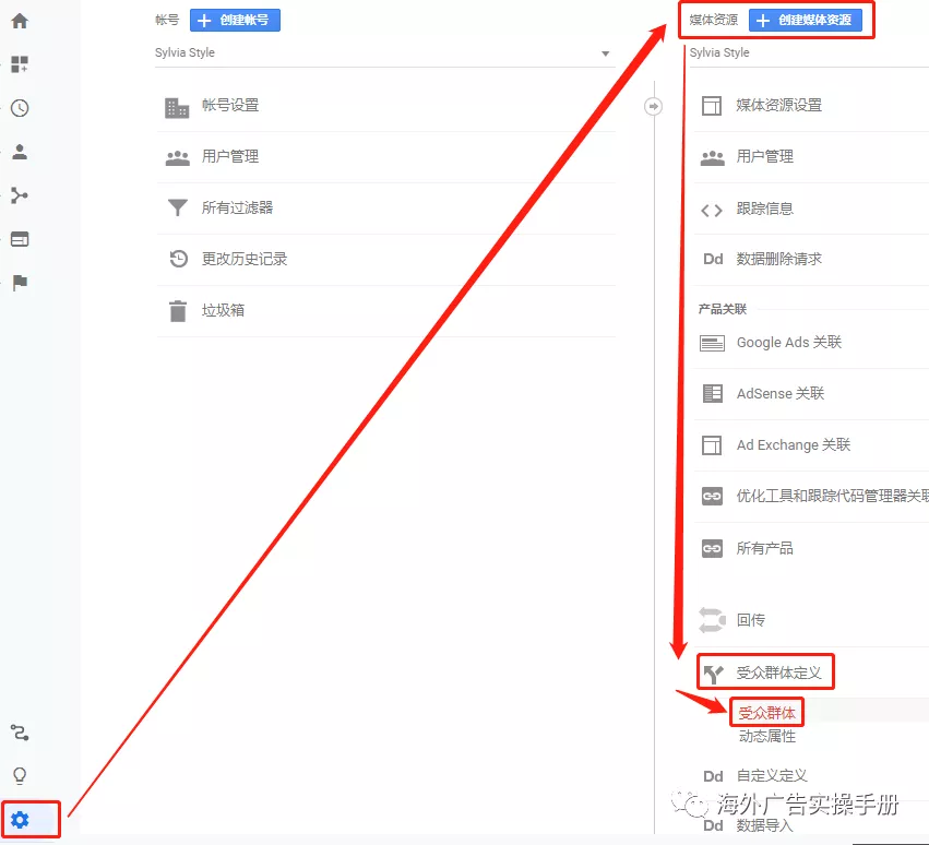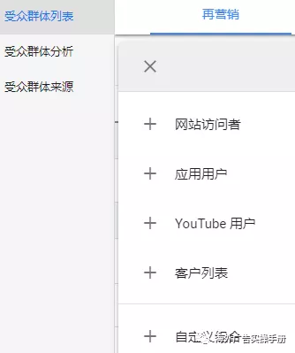 搜索再營銷堪稱別忽略的寶藏,甚至可以達到品牌詞的效果。 原理:把和我們產生互動的一部分用戶加入到受眾列表。 何為產生互動呢?他包括:所有到訪過我們網站的用戶;瀏覽過某一種產品的用戶;在我們網站上做過某種操作的用戶。 搜索在營銷就是當這一部分和我們產生過互動的用戶再次搜索到我們的產品詞或者相關詞的時候,我們的廣告再次對這一部分用戶進行展示。 如何進行搜索再營銷 1、創建受眾列表 補充:受眾列表要盡早創建。(因為只有你創建了受眾列表,才會加受眾。) 受眾列表創建的兩種方法: (1)Google ads (2)Google Analytics