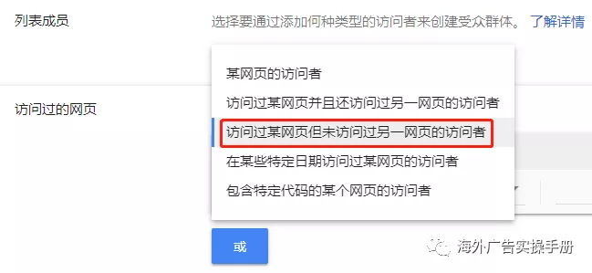 列表成員:(根據實際情況進行選擇)訪問過某網頁但未訪問過另一網頁的訪問者