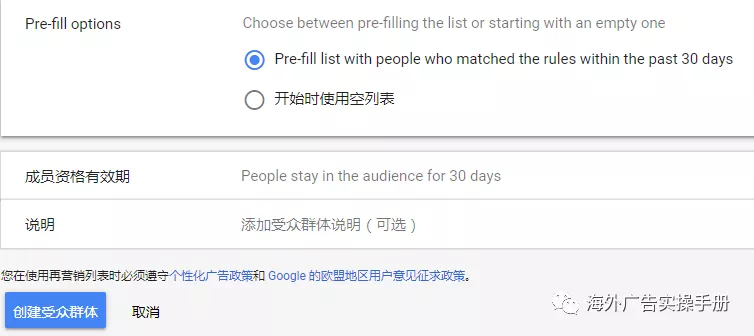 9、Pre-fill options:第一個選項:包含過去三十天符合條件的用戶。第二個選項:從當下符合條件的用戶。