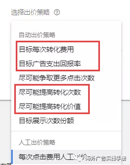 (3)選擇以下智能出價策略 這些策略都是建立在賬戶有足夠多足夠好的轉化數據的基礎上的,新賬戶不要勾選。