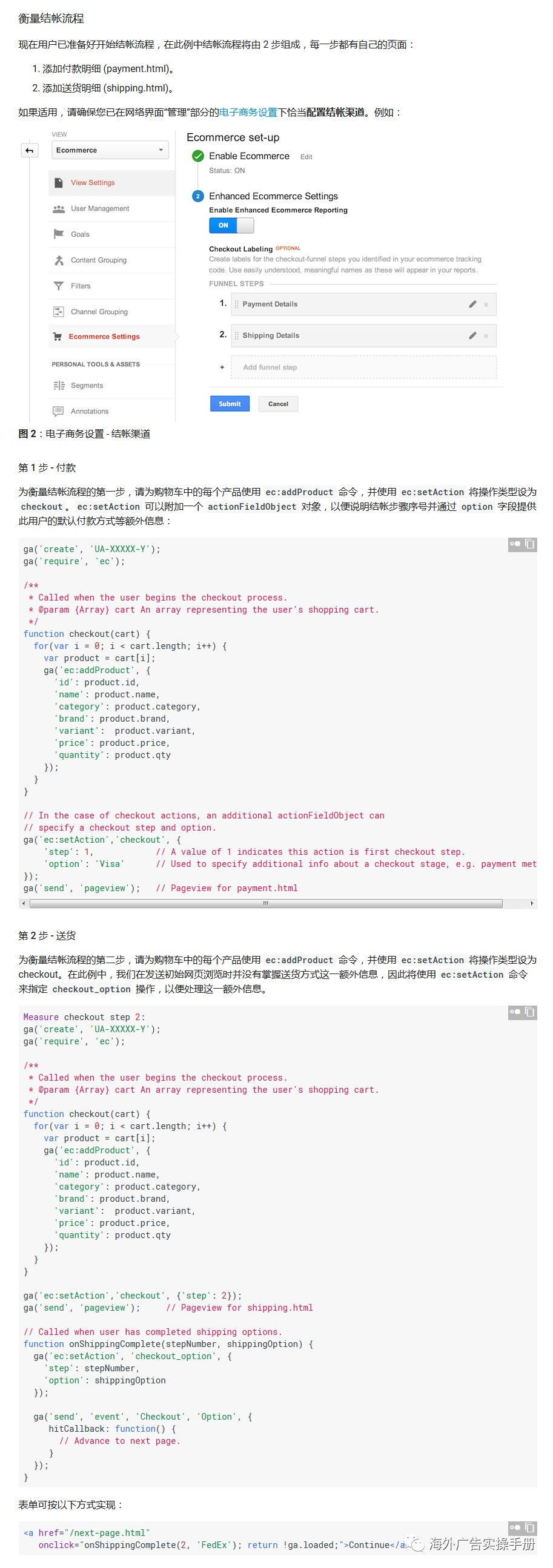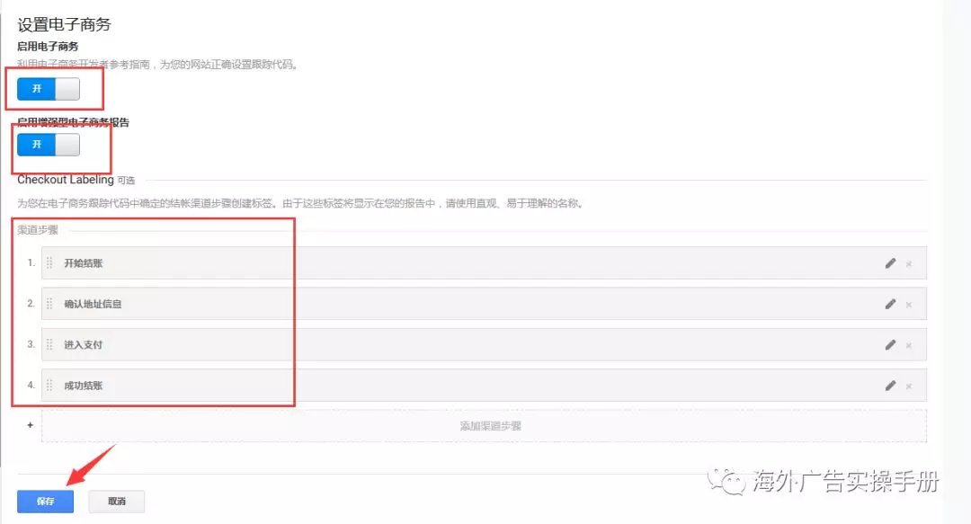 這里的渠道步驟設置,對應的就是網站結賬行為數據的步驟。我們可以自己命名這些步驟,也可以不命名。如果不命名這些步驟的話,結賬行為數據也會顯示,但是會顯示為step 1 step 2 這樣的名稱。建議是寫一下,看起來比較清晰。