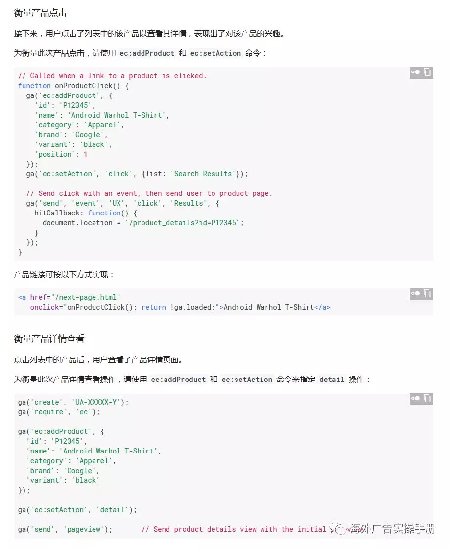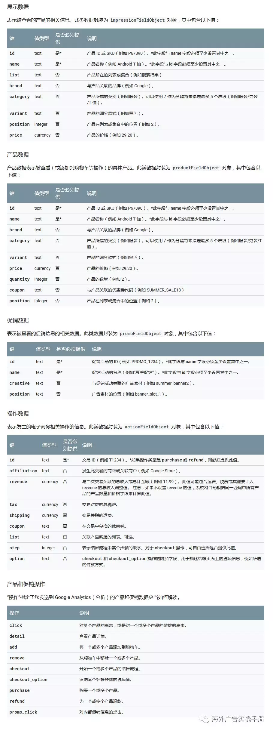 緊跟的是統計對應數據的需要的值。示例中的id是產品的ID,category是產品分類,brand是產品品牌,variant是產品細分款式,list是產品所在列表,position是產品在列表中的位置,dimensiona1這里是自定義的數據。