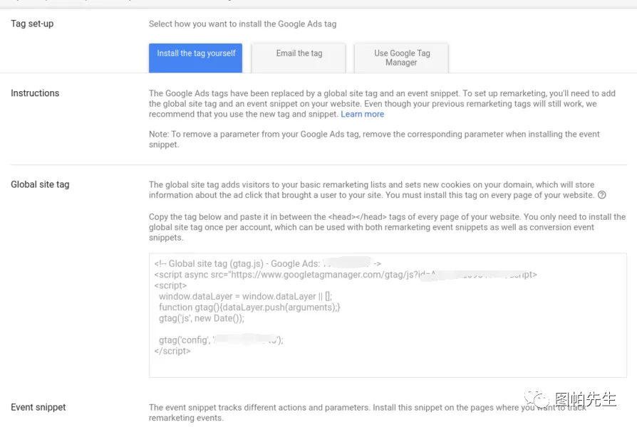 步驟4: 按照你的情況,把Google Ads Tag 放到你的網(wǎng)站內(nèi)。如果完全不明白,就直接挑“Email the tag”把代碼發(fā)給你的Developer