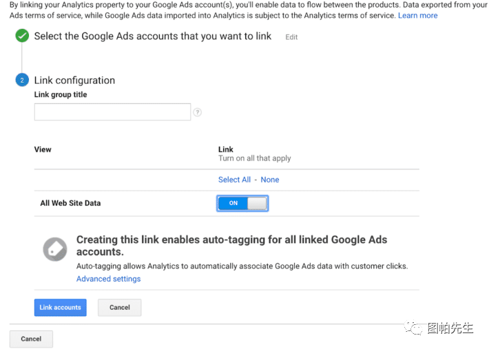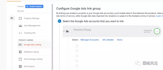 步驟2: 按下 +New Link Group,你會(huì)看到相關(guān)的Google Ads帳戶,再它打勾然后再按Continue,然后Share “All Website Data”,再選Link Account,這樣你己經(jīng)把Google Ads和Google Analytics的帳戶連好