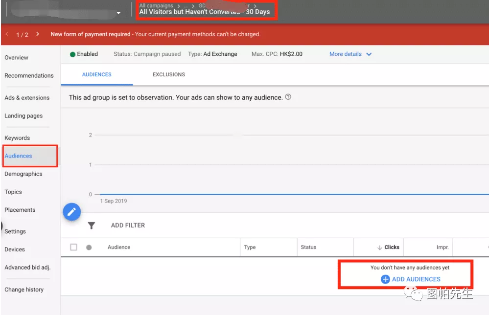 步驟2: 選定你的Display Campaign,Ad Group我會(huì)命為 All Users But Have Not Converted – 30 Days,大概是這樣去分辨各個(gè)Ad Group中的受眾。然后按Audience,再按 + Add Audiencess,意思是這個(gè) GDN 的廣告是Target某特定的Audience List