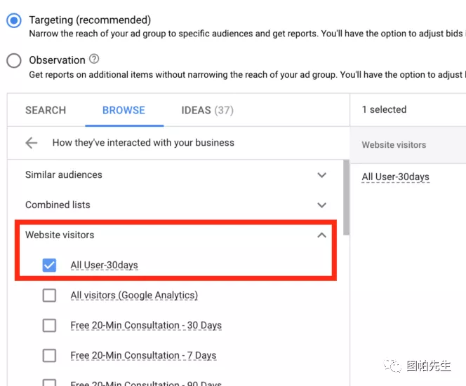 步驟4: 之后你會(huì)看到Similar Audience, Combined List和Website Visitors,當(dāng)然這是再營(yíng)銷廣告所以選擇Website Visitors,之后你會(huì)看到你己經(jīng)在Google Analytics中設(shè)定好的Audience List,在這個(gè)例子,先把All Users (All Visitors) – 30 Days加到Targeting中,然后按Save就完成建立再營(yíng)銷廣告了