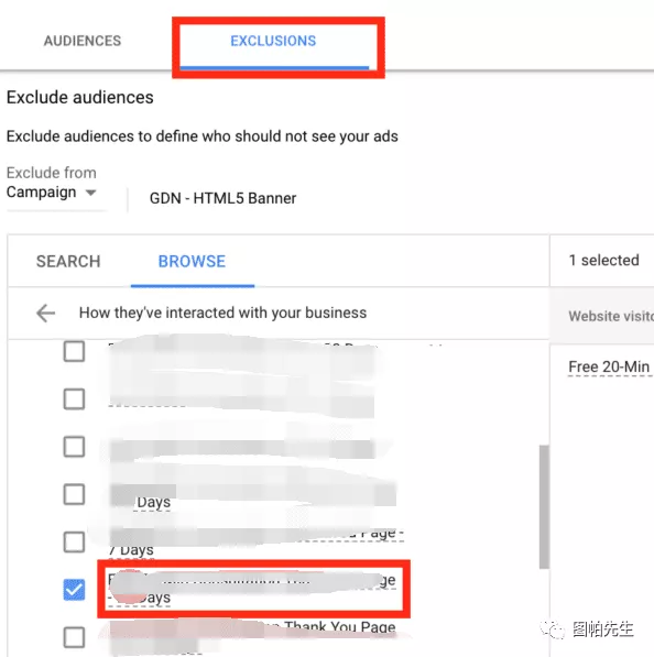 步驟5: 當(dāng)然,一個(gè)完整的再營(yíng)銷廣告千萬(wàn)不要忘記Exclusion——排除不需要的人,最簡(jiǎn)單的是就把Thank You Page購(gòu)物完成頁(yè)面的Audience List做排除,意思就是這個(gè)廣告是Target所有曾經(jīng)游覽網(wǎng)站的人,但廣告不會(huì)投放給已經(jīng)購(gòu)買了的受眾