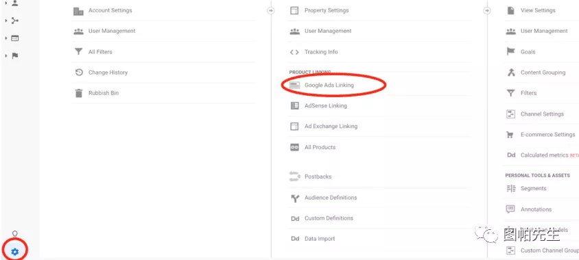 第一步必需把Google Analytics和Google Ads帳戶連起來(lái),打開你的Google Analytics帳戶,先按左下角 Admin ,在Property中再按Google Ads Linking,記得Google Ads和Google Analytics的帳戶必需是相同的郵箱