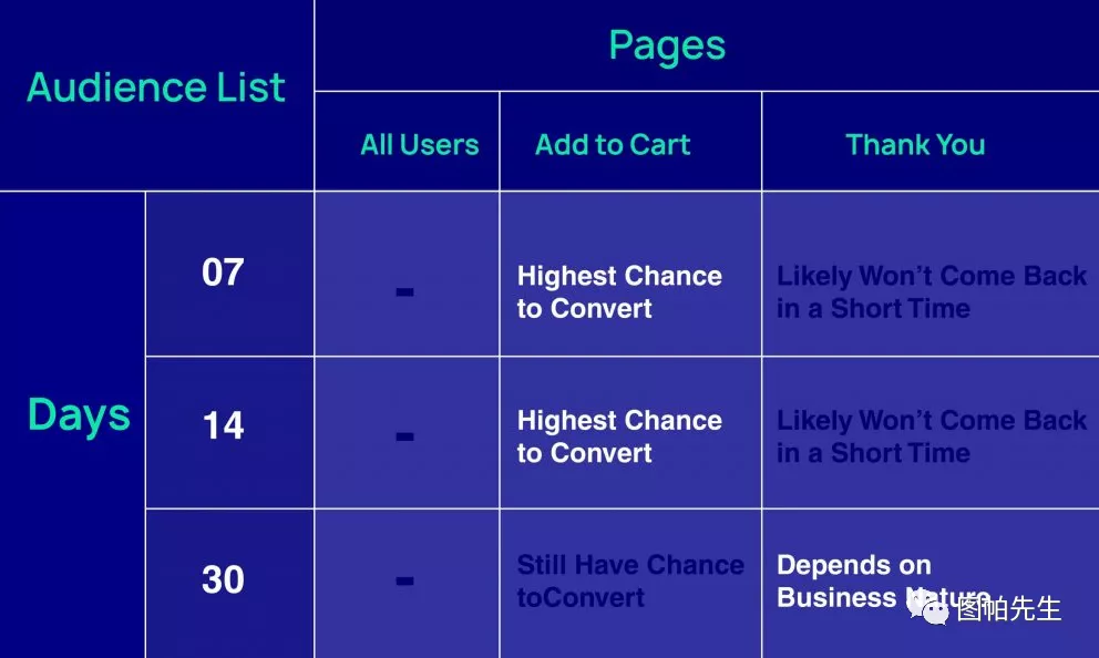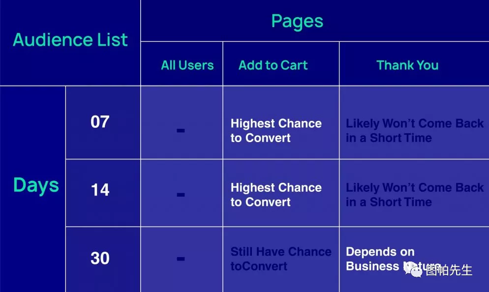如果某受眾己經(jīng)進(jìn)入了Add To Cart的頁(yè)面但未到Thank You Page的話,這一類7 – 14 天的受眾其實(shí)還有很大機(jī)會(huì)回來(lái)購(gòu)買;
