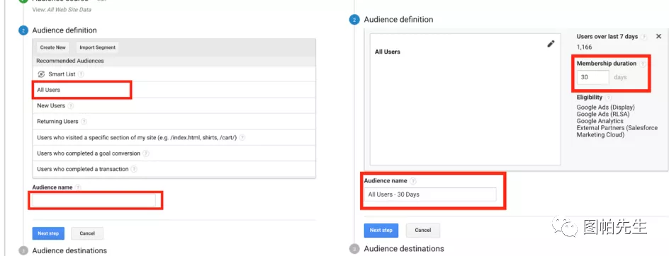 步驟4: 在這例子中選擇All Users,然后在Membership Duration中選擇30 Days,這是代表這個(gè)Audience List所讀取的人數(shù),記緊必需把Audience Name設(shè)定好,再選擇這個(gè)Audience List的Destination,那當(dāng)然是相應(yīng)的Google Ads帳戶!