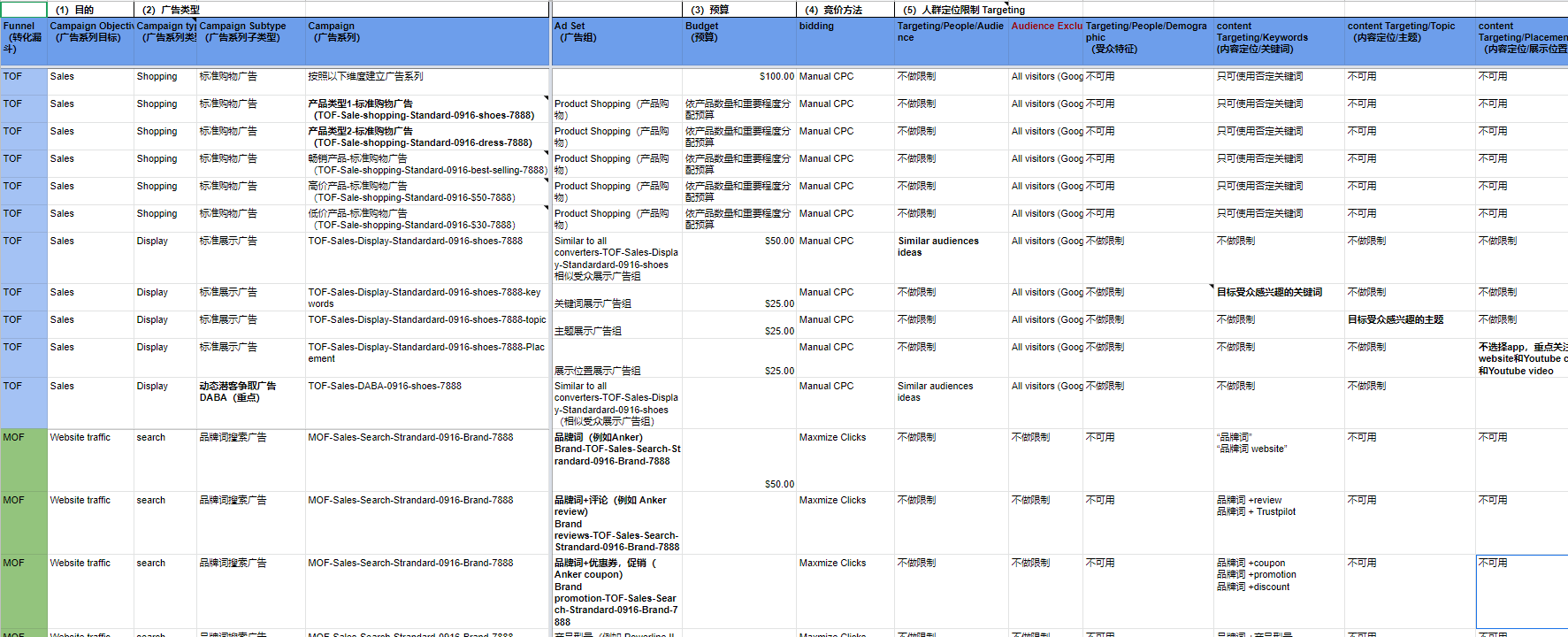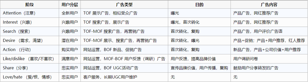 我將模型總結(jié)在一個(gè)表格里:谷歌廣告漏斗策略  如下圖。詳細(xì)解釋見下文