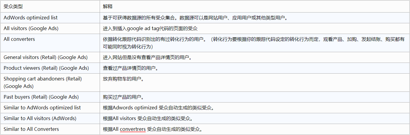 類似受眾(需要等待種子受眾符合要求,就會(huì)自動(dòng)生成)詳見 https://support.google.com/google-ads/answer/2676774