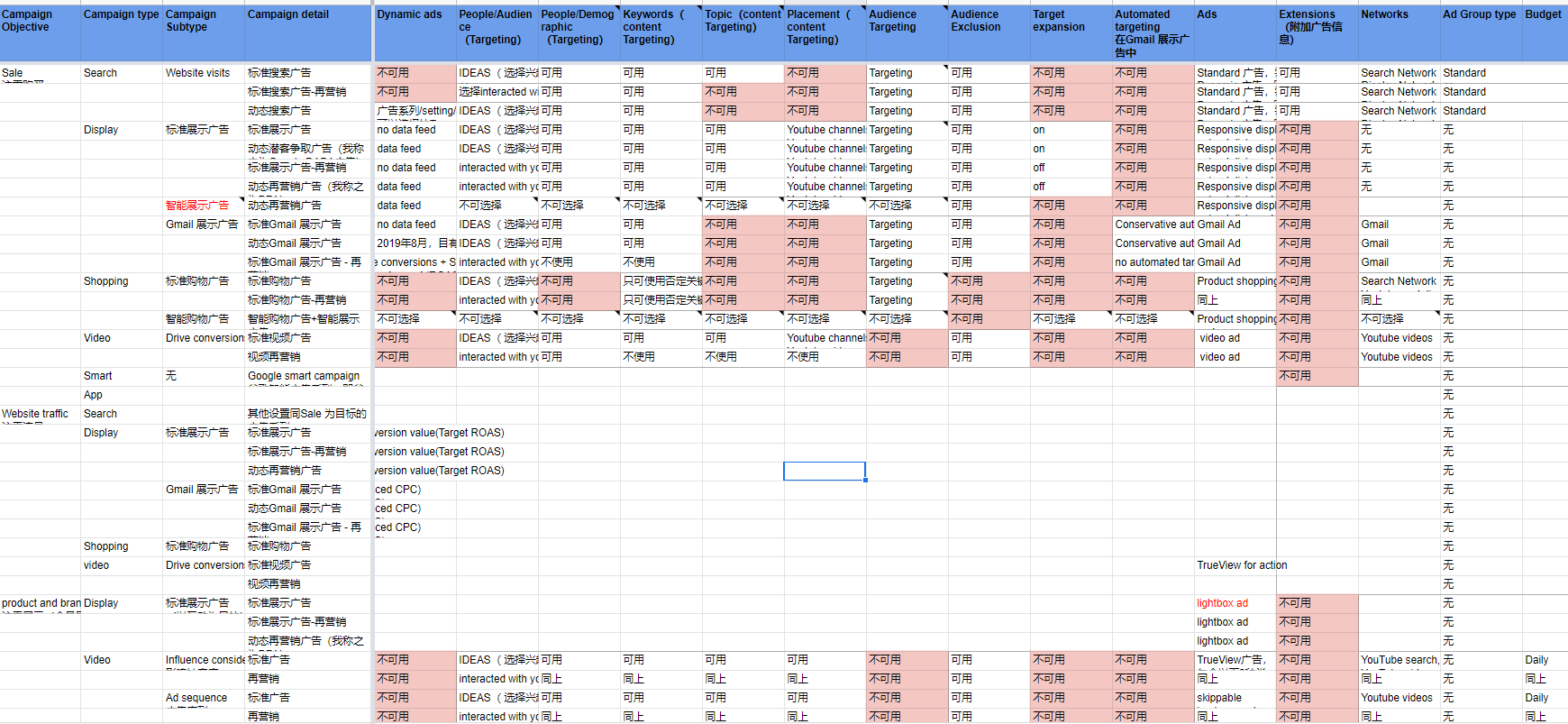谷歌廣告類型很多,廣告系列目標(biāo)有sale,website traffic,product and brand consideration,brand awareness and reach,leads,app promotion和無目標(biāo)。廣告類型有:search,display,shopping,video。廣告子類型還分為標(biāo)準(zhǔn)和智能兩大類。
