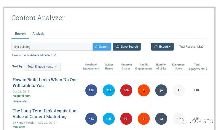 BuzzSumo這款工具,Jack老師在很多篇文章中提到過,確實(shí)是一款很不錯(cuò)的SEO工具.它專為內(nèi)容營(yíng)銷而設(shè)計(jì),很多專業(yè)的谷歌SEO優(yōu)化人員都在使用它.當(dāng)我們輸入對(duì)應(yīng)的關(guān)鍵詞之后,他會(huì)分析這些關(guān)鍵詞排名首頁的相關(guān)內(nèi)容,以及這些內(nèi)容在各社交媒體平臺(tái)的分享情況。