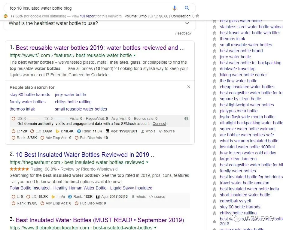 我們來做個示范,比方說我們的關鍵詞是“insulated water bottle(保溫杯)” 那么我們可以用這樣是搜索方式:TOP 10 insulated water bottle blog 搜索結果如下: