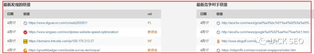 上圖是Linkody的外鏈分析統計,左側是自己網站的外鏈情況,右邊是自己提交某個站點作為競爭對手網站之后查找到的外鏈情況。“FL”代表的是follow標簽;“NF”代表的是nofollow標簽。