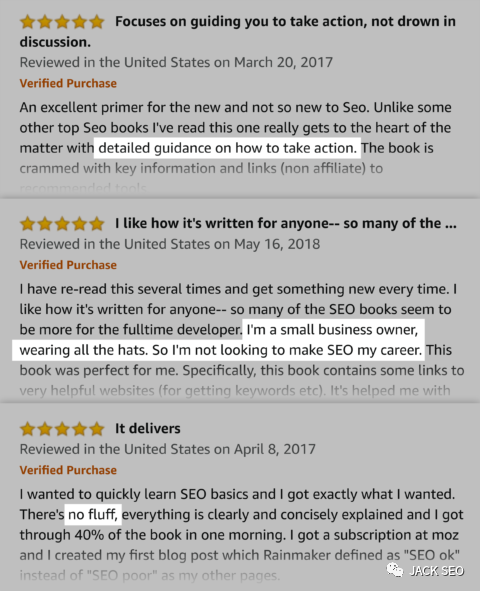 我應(yīng)該指出一點:您可以挖掘Amazon評論…即使您不出售實物產(chǎn)品。例如,我最近查看了有關(guān)Amazon上SEO的熱門書籍的評論: