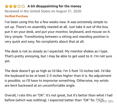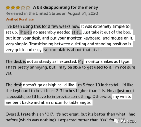 您可以挖掘這些誠實的評論來獲得殺手級副本。例如,檢查此亞馬遜評論中的站立式辦公桌: