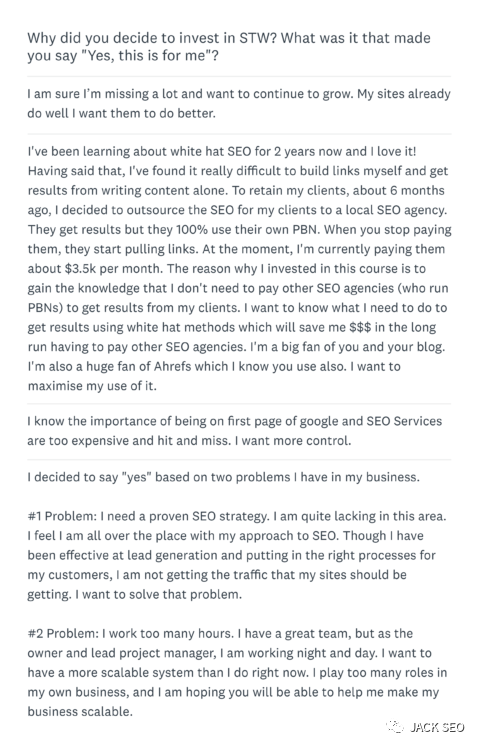 是的,這些響應(yīng)對于客戶研究,定位和創(chuàng)建新產(chǎn)品是無價的。但是它們還可以幫助您編寫直接與目標(biāo)受眾交流的文案。例如,以下是我最近進(jìn)行的一項客戶調(diào)查的實際答復(fù):