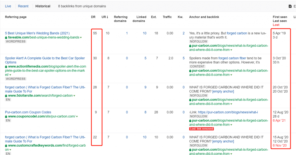 同樣舉個例子,依然是這個 Forged carbon fiber博客頁面,一共5個外鏈。從時間來看肯定不是認主動做的外鏈,時間跨度很長,應該是這些站長主動添加的外鏈 。這種外鏈才是最珍貴的,SEO大佬說過,最好的外鏈就是自然而來的外鏈。
