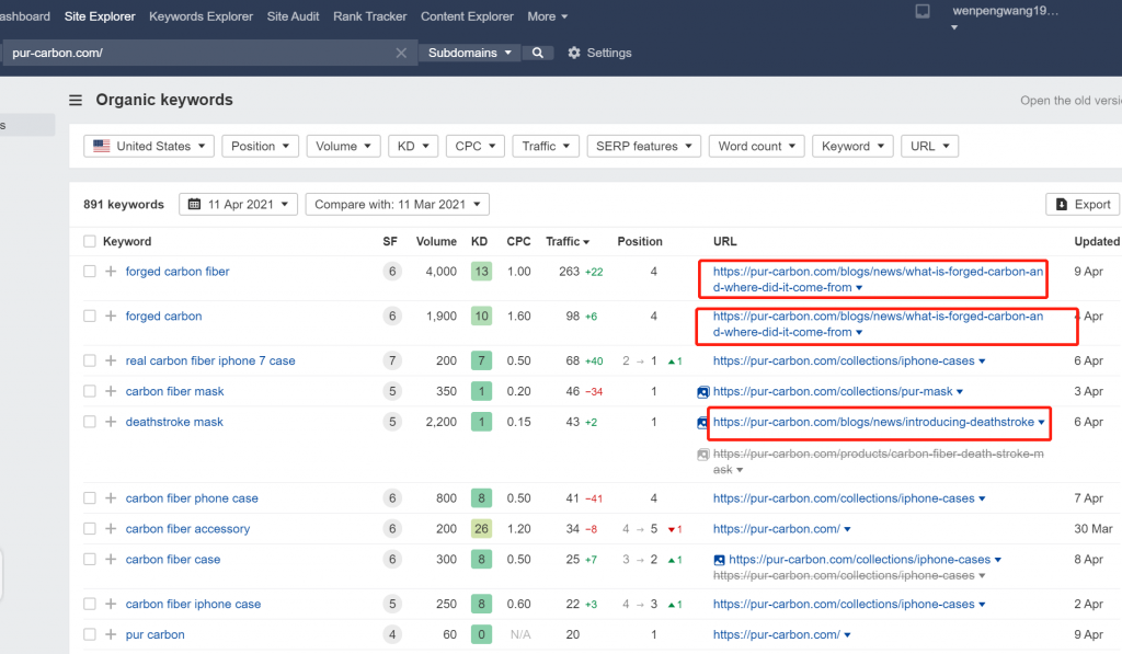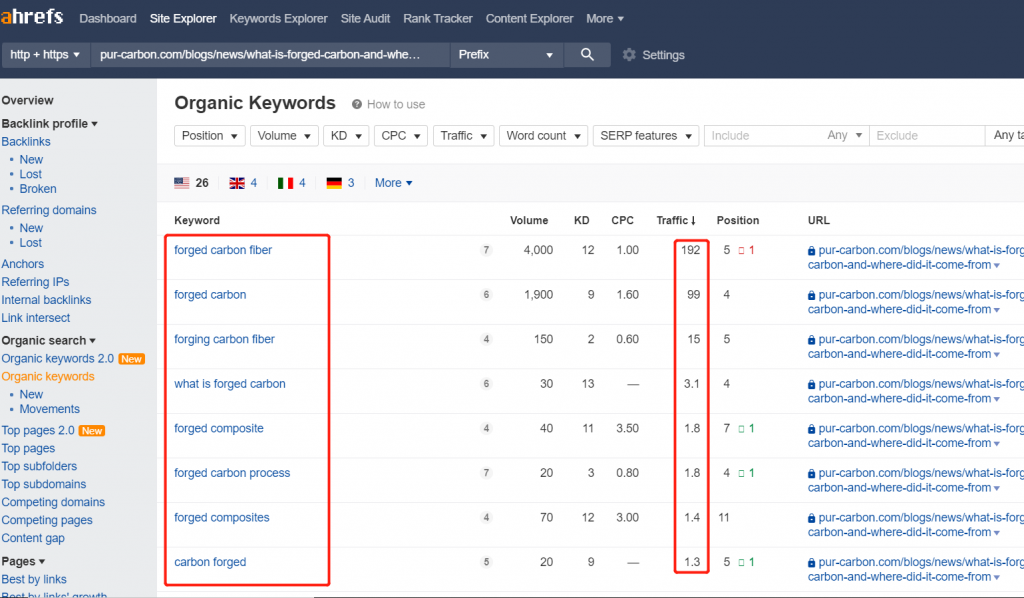 月流量2.4萬,大家看到用ahrefs搜一下top 關鍵詞,你會發現排名前幾的的關鍵詞都是長尾,且流量不小,第一個關鍵詞 “Forged carbon fiber” 帶來流量263個,內容是博客: what is a Forged carbon fiber and where did it come from?