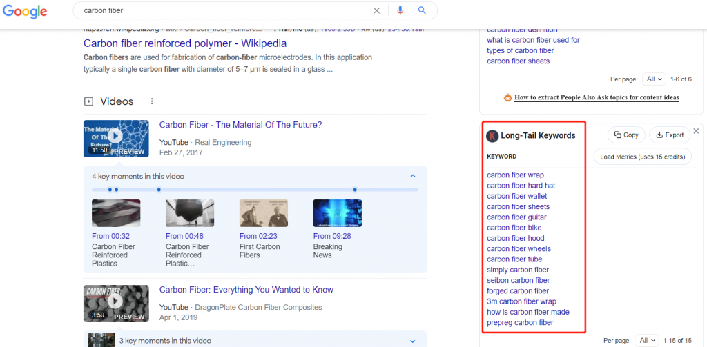 用主關鍵詞搜一下,然后直接篩選出 3個詞及以上的搜索結果。 下圖我還是拿 “carbon fiber” 這個關鍵詞做案例,不看不知道,一看,哇!發現眾多白富美,看到沒,一連串的關鍵詞都是月搜索量1-15k, 而且最讓人眼紅的是,關鍵詞難度才個位數!!! Jack ,這個白富美你不要我可拐走了。