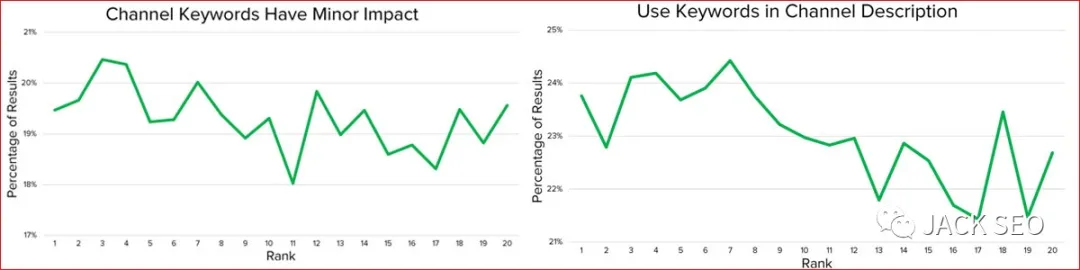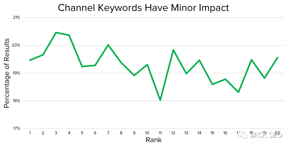 這是一張按按排名前后順序列出的youtube視頻頻道中包含廣泛匹配關鍵字的結果百分比,如上圖中數據顯示,一般情形下,youtube視頻頻道的關鍵詞廣泛匹配性占比大約在19%-20%左右,小幅度的隨著占比下降而靠后排名!