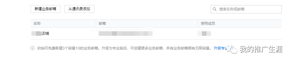 接著你就可以看到“新建業務郵箱了”,但是需要注意的是免費版的只能新建三個業務郵箱,容量是1個G,但是對于剛開始的新手來說足夠使用了,等后面顧客多了,再去升級個付費的版本。