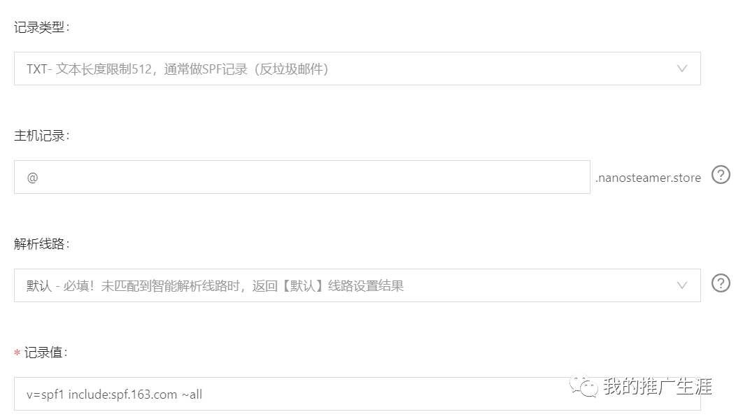 添加第二條,記錄類型選擇TXT,主機記錄@,記錄值v=spf1 include:spf.163.com ~all。