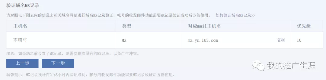 點擊“下一步”,我們需要驗證域名MX記錄了,